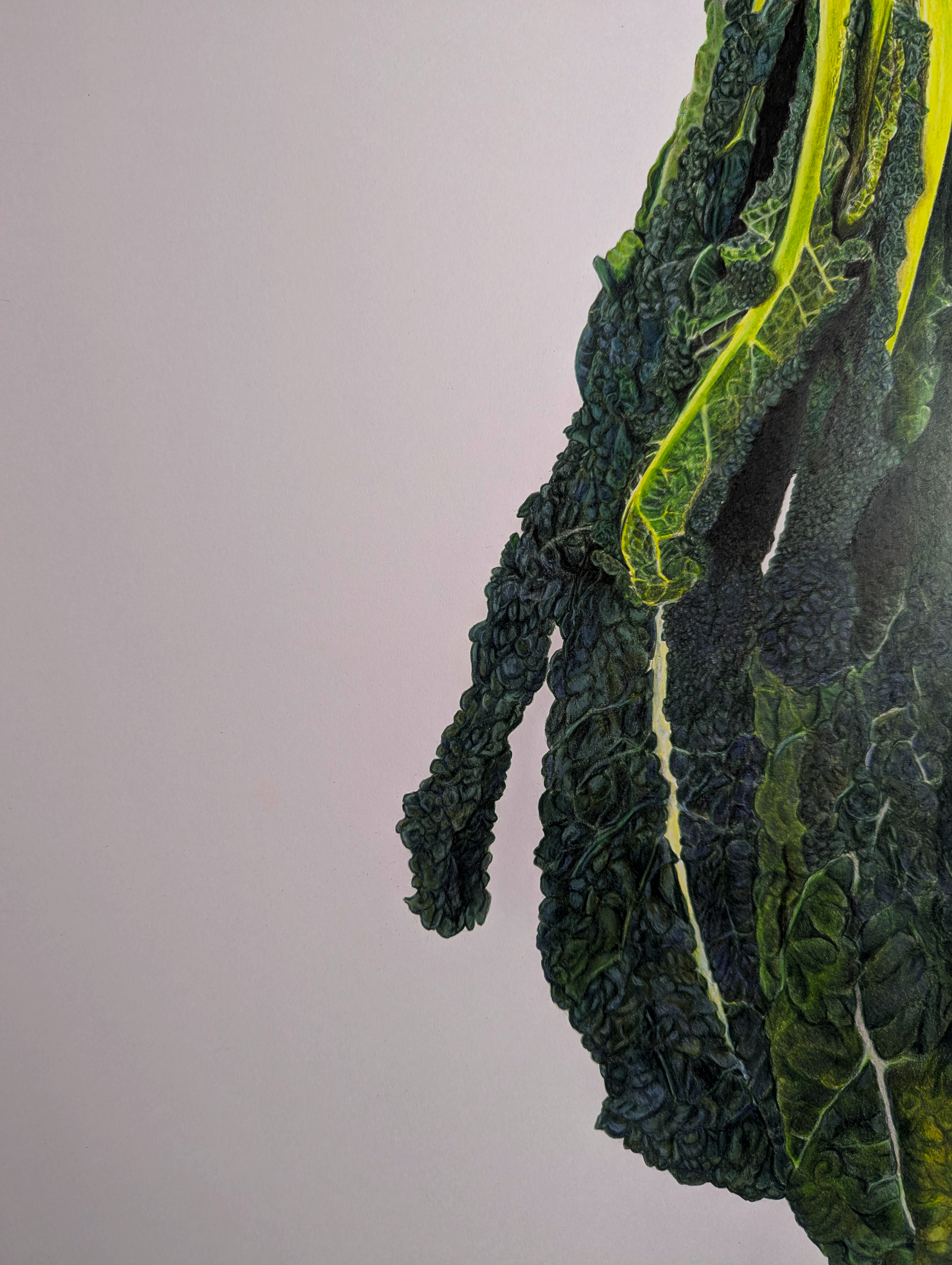 A stunning hyper-realistic original drawing of a cavolo nero's leaves, created with coloured pencils on paper. Eat Your Veggies transforms everyday nature into fine art - a hand-drawn still life that celebrate detail, texture, and simplicity.